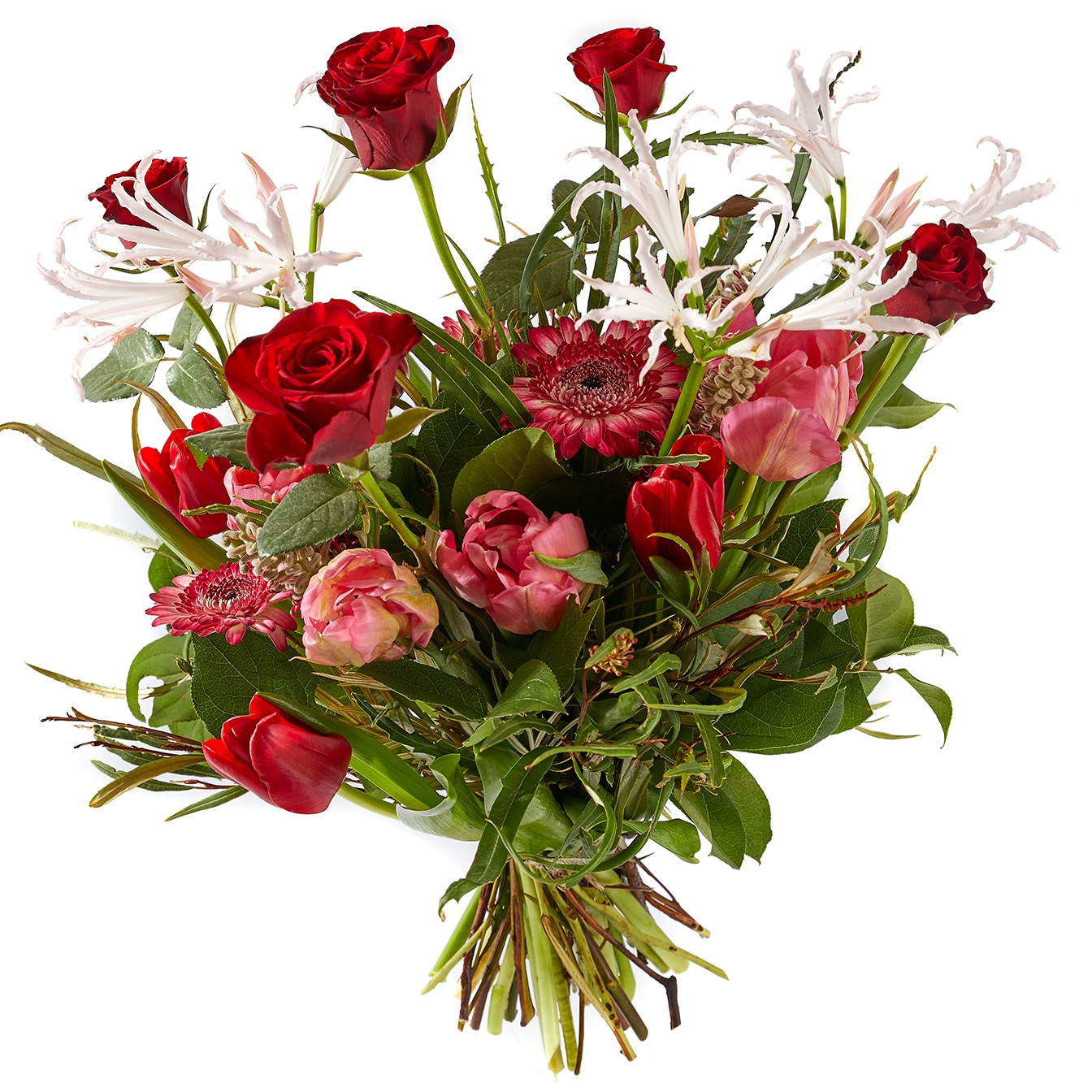 Luchtig plukboeket rood met voorjaarsbloemen
